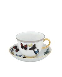 Filiżanka do herbaty ze spodkiem marki Christian Lacroix. Ozdobiona szykownymi, ręcznie malowanymi motylami. Idealnie będzie komponować się z pozostałymi elementami zastawy projektu CL.